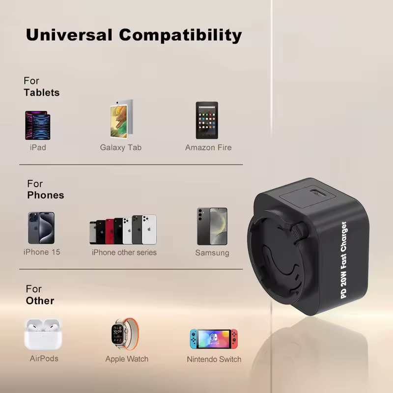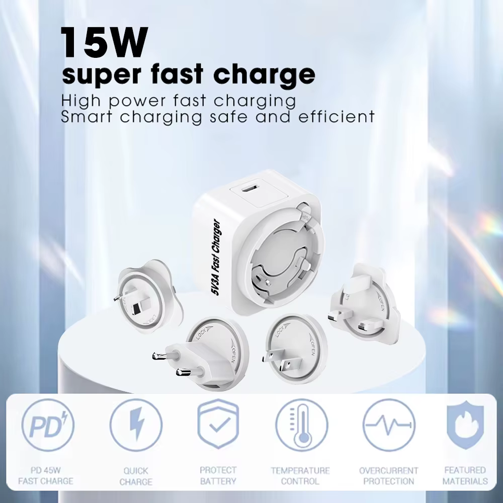 USB Charger Wall Adapter 15W Interchangeable Plug Type-C Port 5V 2.5A 3A 2A Universal Pedal Board Charger OVP/OTP/OCP PD 3.0